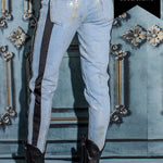 Jotero en denim con cortes laterales en terciopelo y acabado metalizado, un diseño con detalles únicos
